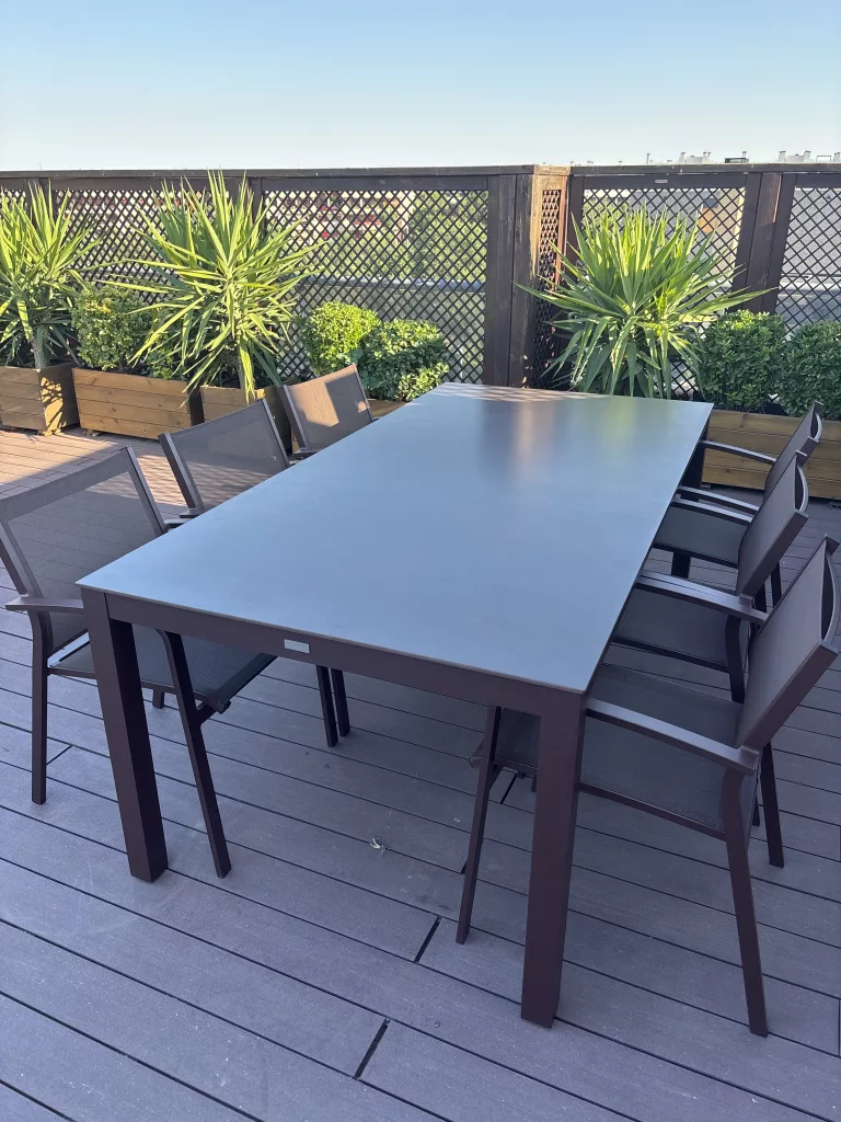 Compré la mesa Adria en la medida 300×120, con tapa de dekton en color gris. La verdad que estoy encantado con la mesa, ha pasado el invierno a la intemperie y no ha sufrido absolutamente nada, está como el día que la trajeron a casa.